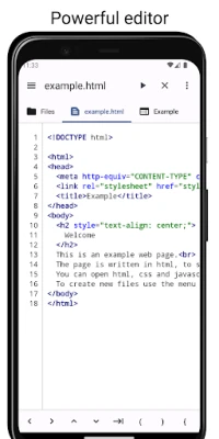 Editor - Code completion for java. - Real Time error checking. - Auto backup if you leave the app without saving. - Undo and Redo. - Support for characters not normally present in the virtual keyboard like tabs and arrows.