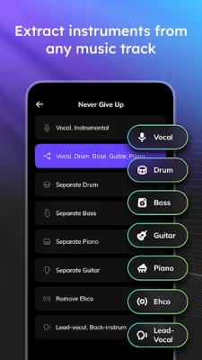-AI Audio Separation of stems: Easily separate vocals, drums, guitar, bass, piano, strings, and other instruments in any song. Musiclab serves as your vocal remover or backing track maker.